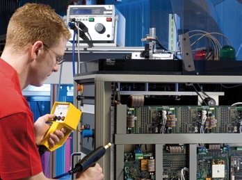 The test object is connected to the central earth point. All three tests can be performed against this single ground point with the same test pistol. By activating the selection switches on the hand held control panel, the test methods can be switched over. A test pistol with a pressure dependent start button is used. To start the teat the test tip has to be pressed agianst the test object |